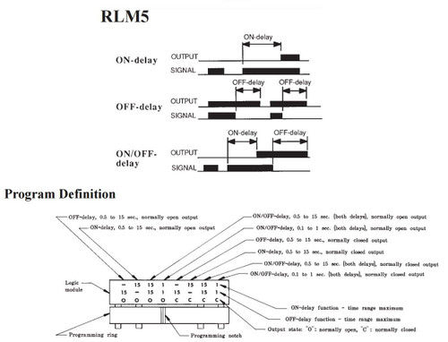 MAXI-BEAM Logic Module. Delay Logic. ON Delay OFF Delay or ON/OFF Delay. Part Number: 25548. . Add sensor response delay of approximately 2% of maximum OFF-DELAY time. MAXI-BEAM sensors offer built-in timing logic with the addition of a logic module. There are two logic modules available. Model RLM5 is programmable for ON-DELAY, OFFDELAY, and ON/OFF DELAY timing logic. Model RLM8 offers both ONE-SHOT and DELAYED ONE-SHOT functions. A programming ring is supplied with each logic module. Programming of the logic function, timing range, and output state is similar to sensor head programming. Both logic modules feature 15-turn, clutched potentiometers for accurate timing adjustments. Once programmed, the logic module may be rotated in 90-degree increments to position the timing adjustments for easiest access. Logic modules are housed in the same tough molded VALOX® which is used for the other MAXI-BEAM components. The logic module and its programming ring simply slip between the MAXI-BEAM sensor head and power block (see photograph, page 3). The assembly is bolted together with no interwiring necessary. The component interfaces are quad-ring sealed.. Banner. Banner Engineering. RLM5.