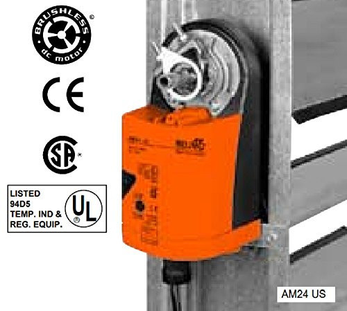 Power supply 24 VAC ± 20% 50/60 Hz 24 VDC ± 10%. Power Consumption: 2.5 W. Transformer Sizing: 4.5 VA (Class 2 power source). Electrical Connection: 3 ft, 18 GA, appliance cable, 1/2” conduit connector. Made in Switzerland. Belimo AM24 US Damper Actuator, On-Off Floating Point Control, Non-Spring Return, Direct Coupled, 24V - APPLICATIONS: For on-off and floating point control of dampers in HVAC systems. Actuator sizing should be done in accordance with the damper manufacturerÂ's specifications. The actuator is mounted directly to a damper shaft up to 3/4Â" in diameter by means of its universal clamp, or up to a 1.05Â" jackshaft with the optional K4-1 clamp. A crankarm and several mounting brackets are available for applications where the actuator cannot be direct coupled to the damper shaft. OPERATIONS: The actuator is not provided with and does not require any limit switches, but is electronically protected against overload. The angle of rotation is mechanically limited to 95°. When reaching the damper or actuator end position, the actuator automatically stops. The gears can be manually disengaged with a button on the actuator cover. The position of the actuator is indicated by a visual pointer. The anti-rotation strap supplied with the actuator will prevent lateral movement. The AM24-S US version is provided with two built-in auxiliary switches. These SPDT switches are provided for safety interfacing or signaling. The switching function is adjustable between 0 and 95°. SPECIFICATIONS: Overload protection electronic throughout 0 to 95° rotation. Angle of rotation 0-95° adjustable stops. Torque min 160 in-lb [18 Nm]. Direction of rotation reversible with switch Â"CCW-CWÂ". Position indication clip-on indicator. Running time 110 to 150 sec. for 0 to 160 in-lb. Manual override external push button. Humidity 5 to 95% RH, non-condensing. Ambient temperature -22°F to +122°F [-30°C to +50°C]. Storage temperature -40°F to +176°F [-40°C to +80°C]. Housing type NEMA 2 (IP54 with cable entry down). Housing material rating UL94-5V (flammability rating). Noise level less than 45 dB (A). Servicing maintenance free. Agency listings UL 873 listed, CSA C22.2 No.24 certified, CE. Quality standard ISO 9001. Weight 2.8 lbs [1.3 kg].. Belimo. Belimo. AM24 US.