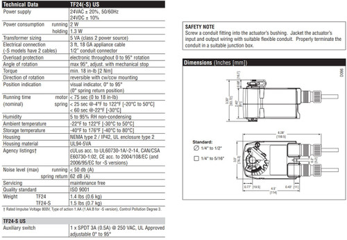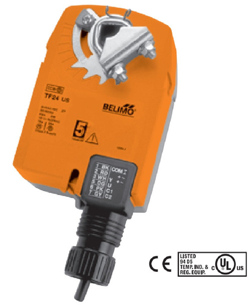 Power supply 24VAC ± 20%, 50/60Hz, 24VDC ± 10%. Power consumption running 2 W, holding 1.3 W. Transformer sizing 5 VA (class 2 power source). Electrical connection: (-S models have 2 cables) 3 ft, 18 GA appliance cable, 1/2†conduit connector. Overload protection electronic throughout 0 to 95° rotation. Torque min. 18 in-lb, for control of air dampers - Application - For On/Off, fail-safe control of dampers in HVAC systems. Actuator sizing should be done in accordance with the damper manufacturer’s specifications. Control is On/Off from an auxiliary contact, or a manual switch. The actuator is mounted directly to a damper shaft from 1/4†up to 1/2†in diameter by means of its universal clamp, 1/2†shaft centered at delivery. A crank arm and several mounting brackets are available for applications where the actuator cannot be direct coupled to the damper shaft. Operation - The TF series actuators provide true spring return operation for reliable fail-safe application and positive close off on air tight dampers. The spring return system provides consistent torque to the damper with, and without, power applied to the actuator. The TF series provides 95° of rotation and is provided with a graduated positionindicator showing 0° to 90°. The actuator may be stalled anywhere in its normal rotation without the need of mechanical end switches. Power consumption is reduced in holding mode. The TF24-S US versions are provided with 1 built-in auxiliary switch. This SPDT switch is provided for safety interfacing or signaling, for example, for fan startup. The switching function is adjustable between 0° and 95°.. Belimo. Belimo. TF24-S US.