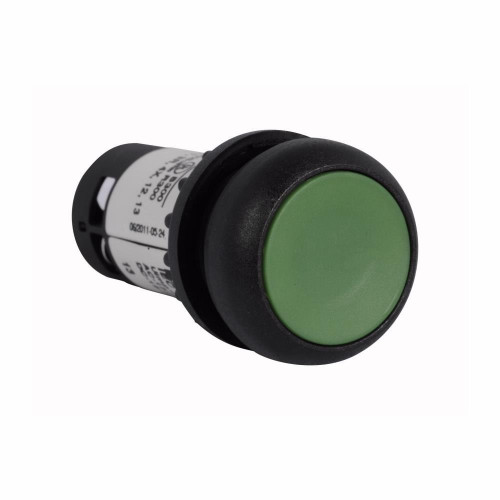 Eaton C22S-DR-G-K10 C22 compact Pushbuttons are a complete line of monoblock type pushbuttons with the contact blocks, mounting adapter, and operator all-in-one. The C22 pushbuttons offer the same look and feel as their modular counterpart, the M22. They also carry many of the same rugged ratings and options, such as laser etching, field convertibility, and LED technology. They also feature IP65 rear ratings when purchased with pigtail, M8/M12/flying lead. EATON Non-Illuminated Pushbutton, Compact, Series: RMQ C22, 22.5 mm Size, 1NO Contact Configuration, Maintained Contact Mode, Bezel/Housing: Black Nylon Bezel, Button/Flush Actuator, Screw Terminal, NEMA 4X/13/IP67/IP69K Enclosure, Plastic, Green, Environmental Conditions: -25 to 70 deg C Operating Temperature.. Eaton. Eaton Corporation. C22S-DR-G-K10.