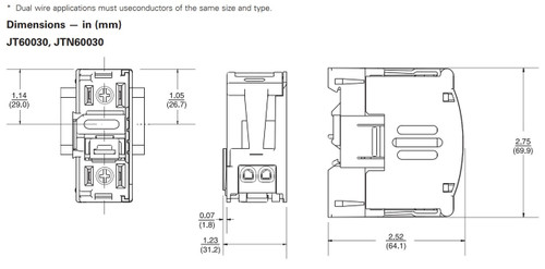 Eaton Bussmann series JT finger-safe fuse holder, N, Industrial Controls, Process Controls, Small HP VFDs, 30 A, Class J, 18 to 8 AWG tin plated copper alloy terminal, Thermoplastic, 35 mm DIN rail, 600 V. Cooper Bussmann. Eaton Corporation. JTN60030.