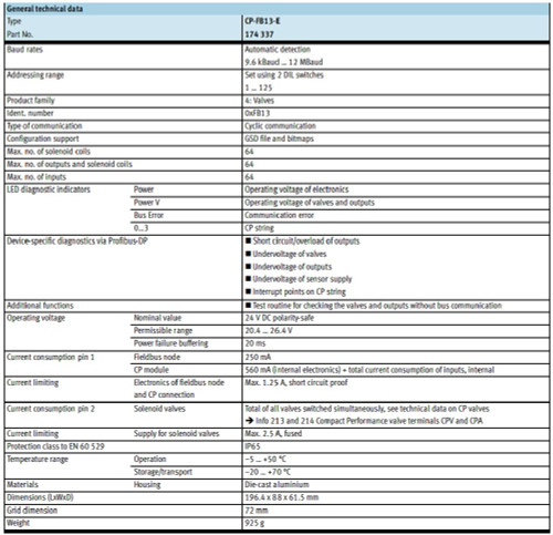 . . . . . CP Compact Line modules: ideal for handling and assembly. In combination with the SC valve terminal series, the I/O solution for the electronics industry. Always embedded in the CP installation system. Easy expansion: Compact and space-saving Robust: IP65 238.1.PSI Product Short Information Thanks to their compact dimensions (length 150 mm, width approx. 30 mm, height approx. 23 mm (without CP connector), they can get closer to sensors and actuators. An electronic circuit cast in plastic affords the crucial weight advantage in comparison with aluminium modules. The new eightfold M8 or M12 modules are the thrifty alternative to 16-fold M8 or M12 CP modules. Depending on the place of use, in IP65/67 or, as spring-tension terminal modules, at home in the control cabinet. This fieldbus node handles communication between the decentralised CP system and a higher-order master via Profibus DP. The fieldbus node is a slave station on the fieldbus and represents the I/O data and diagnostic information of the connected CP modules on the network. For the electrical peripherals, this module provides the separate electrical system supply for the electronics modules and sensor supply, and the load current of the valves. The status of the voltage supplies and the bus communication is indicated via the LEDs Power, Power Valves, String Error and Bus Error. Profibus-DP.. Festo. Festo. 174337.