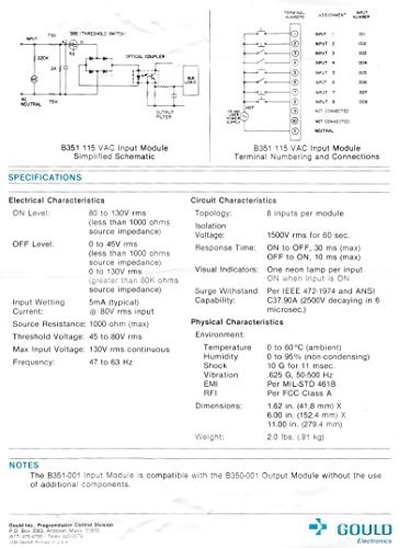 Gould (Now Modicon, Part of Schneider Electric). Input Module for Micro 84 Controller PLC Systems. Eight Independent 115 VAC Inputs. Circuit Isolation of 1500 VAC. Field Side Status Indicators. Gould (Now Modicon, Part of Schneider Electric). Input Module for Micro 84 Controller PLC Systems. Eight Independent 115 VAC Inputs. Circuit Isolation of 1500 VAC. Field Side Status Indicators. Transient Protection. Surge Withstand Capability in Compliance With IEEE 472-1974 and ANSI C37.90A. Option Fanning Strip permits module removal without disturbance to field wiring. UL Listed and CSA Certified. Designed for harsh plant for environments.. Modicon. Gould. AS-B351-001.