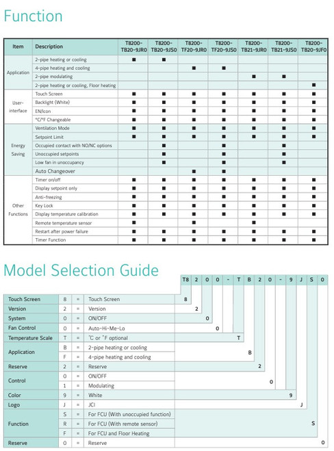 T8200...JS0/R0 Touch screen thermostats are designed to control heating, cooling, or year round air conditioning unit in Commercial, Industrial and Residential Installation. Typical applications include the control of fan coil units, packaged terminal air conditioners and combination of heating and cooling equipment. As part of the system, T8000 controls a two way or three-way valve and a multi-speed line voltage fan.. Johnson Controls. Johnson Controls. T8200-TB20-9JF0.