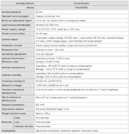 Sensing Distance: 30 mm. Standard Sensing Object: Opaque, 6-mm dia. min.. Minimum Detectable Object: 3-mm dia. min. (black mark on transparent sheet). Light Source (Wavelength): Infrared LED (950 nm). Power Supply Voltage: 12 to 24 VDC ?é??10%, ripple (p-p): 10% max.. Omron E3S-GS3E4 2M Grooved-Type Photoelectric Sensor Switch, 30mm Dist IR Light. Omron. Omron Corporation. E3S-GS3E4 2M.