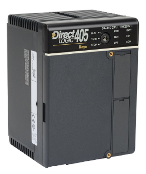 Direct Logic 405 CPU. (1) RS-232 (DB15) and (1) RS-232/RS-422 (DB25) Ports. External 120-240 VAC Required. Battery Included. . SPECIFICATIONS: Brand: DL405. Item: CPU. Programming Language: Ladder. Programming Software: DirectSOFT programming software v4.0 or later. Communication Port and Connection Type(s): (1) RS-232 (DB15), (1) RS-232/RS-422 (DB25). Port Protocol(s): DirectNET, K-sequence, serial remote I/O programming/monitoring. Port Speed(s): fixed at 9.6k baud, up to 19.2k baud. Real Time Clock/Calendar: Yes. Retentive Memory: Yes. Battery Backup: Yes. External Power Requirement: 120-240 VAC. Includes: D3-D4-BAT battery.. Automation Direct. Automation Direct. D4-440.