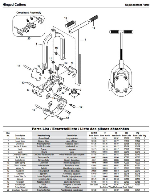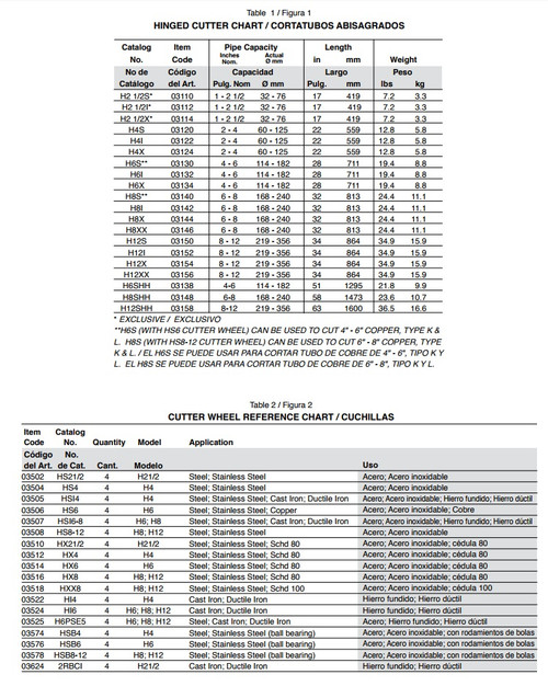 Catalog No.: H8S. Item Code: 03140. Pipe Capacity: 6 - 8 (in-nom.) / 168 - 240 (actual O.D. mm). Cutter Wheel: H8-12. Application: Copper, Steel/Stainless Steel Sch. 40. Reed H8S 03140 6 - 8 Inch Hinged Pipe Cutter for Copper, Steel/Stainless Steel Sch. 40 - Another Reed invention that needs only 4?ó?é¼?¥ (102 mm) of clearance around pipe. Efficient handle swing of only 90 deg to 110 deg. Can be used anywhere - in the ditch, underwater, overhead, in racks of pipe! SPECIFICATIONS: Catalog No.: H8S. Item Code: 03140. Pipe Capacity: 6 - 8 (in-nom.) / 168 - 240 (actual O.D. mm). Cutter Wheel: H8-12. Application: Copper, Steel/Stainless Steel Sch. 40. Length: 32 (in) / 813 (mm). Weight: 24.4 (lb) / 11.1 (kg).. Reed Tool. Reed Tool. HS8.