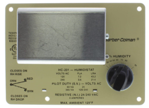 Humidity Range: 15 to 95 % RH. SPDT switching for humidification/dehumidification. Agency listed room and duct units. Long life nylon elements. Standard locking feature. These controllers provide low or line voltage on-off single stage control of humidifiers, dehumidifiers, valves, solenoid valves, compressors, relays, etc. FEATURES: SPDT switching for humidification/dehumidification. Agency listed room and duct units. Long life nylon elements. Standard locking feature.. Barber Colman. Schneider Electric. HC-201.
