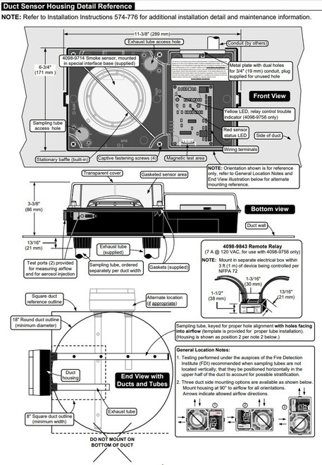 Duct Sensor Housing with Supervised Multiple Relay Output. Requires Separate 24 VDC Fire Alarm Power and 4081-9008 End-of-Line Resistor Harness. Includes One 4098-9843 Relay. Compatible With: Simplex fire alarm control panel models: 4100ES, 4010ES, 4008, 4010, 4100U, and legacy products 4020, 4100/4100+, and 4120.. . TrueAlarm Analog Sensing Addressable Duct Sensor - Duct sensor housing with supervised output for multiple remote relays; requires separate 24 VDC; includes one relay ?»'?? Relay output is under panel control. At the panel, relay output can be activated manually or in response to a separate alarm or other input. Includes factory installed TrueAlarm photoelectric smoke sensor and features: Individual sensor information processed by the host control panel to determine sensor status. Digital transmission of analog sensor values via IDNet or MAPNET II, 2-wire communications. Programmable sensitivity, consistent accuracy, environmental compensation, status testing, and monitoring of sensor dirt accumulation. UL listed to Standard 268A. Clear cover allows visual inspection. Test ports provide functional smoke testing access with cover in place. Mounts to rectangular ducts or round ducts; minimum size is 8?ó?é¼?¥ (203 mm) square or 18?ó?é¼?¥ (457 mm) diameter. Magnetic test feature for alarm initiation at housing. Optional weatherproof enclosure is available separately (refer to data sheet S4098-0032). Diagnostic LEDs (on interface board): Red Alarm/Trouble LED for sensor status and communications polling display. Yellow LED for open or shorted trouble indication of supervised relay control (4098-9756 only).. Simplex Grinnell. TE Connectivity. 4098-9756.