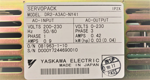. . . . . Yaskawa DR2-A3AC-NY41 Servopack Servo Motor Controller. Yaskawa. Yaskawa Electric. DR2-A3AC-NY41.